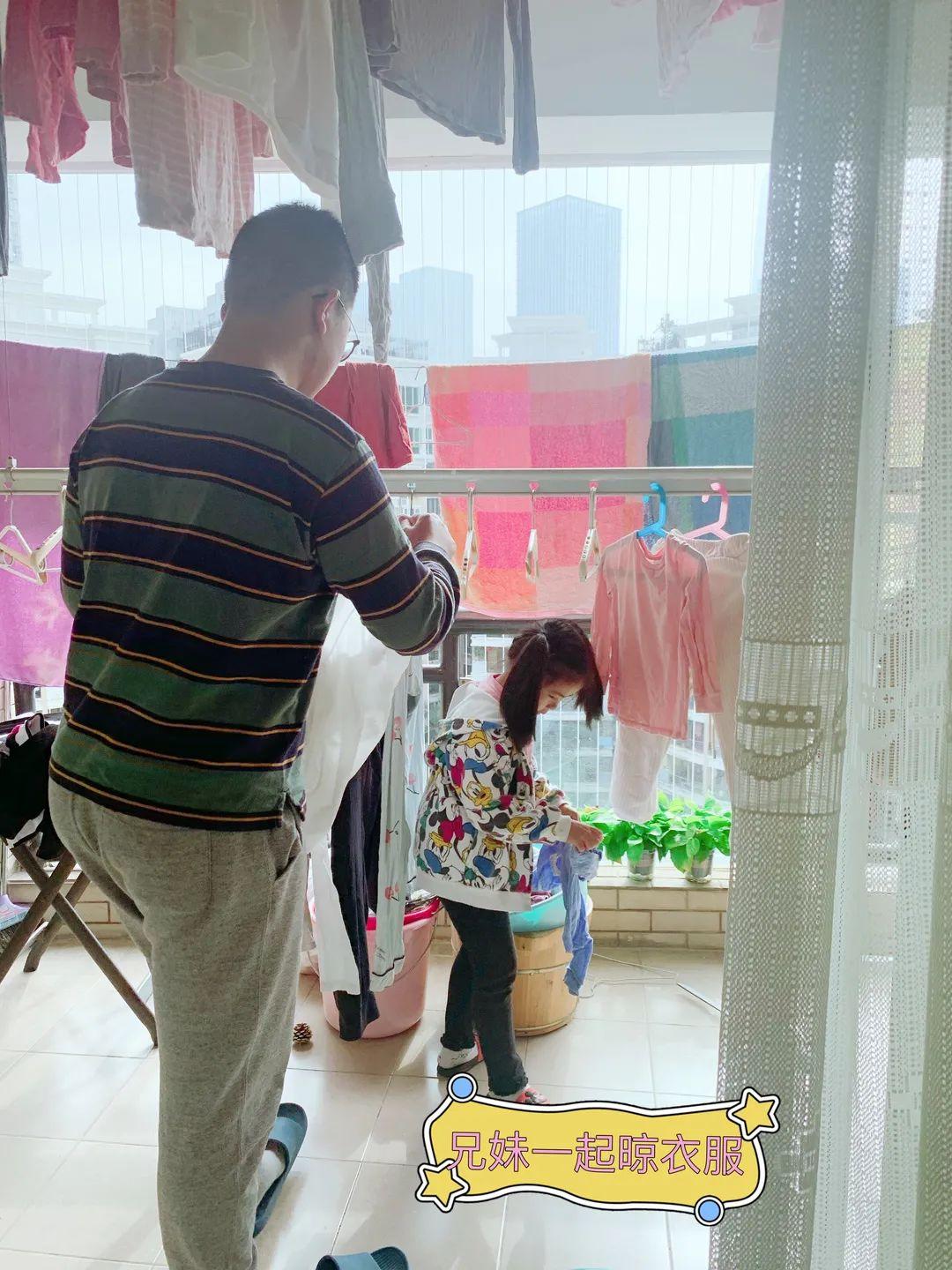 来到阳台,带妹妹一起晾晾衣服;