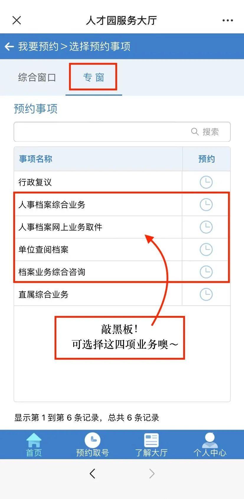 3.点击“我要预约”—“专窗”—“选择预约事项”(人事档案综合业务/人事档案网上业务取件/单位查阅档案/档案业务综合咨询),点击您需要办理的业务即可。