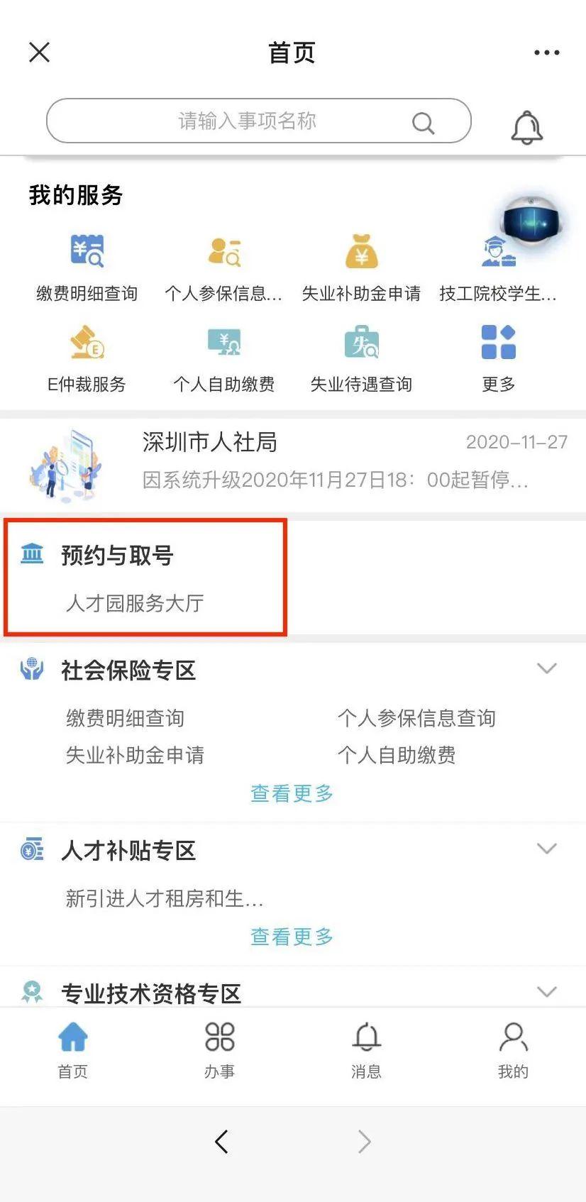 2.点击菜单栏“办事”—“掌上办事”—“预约与取号”。