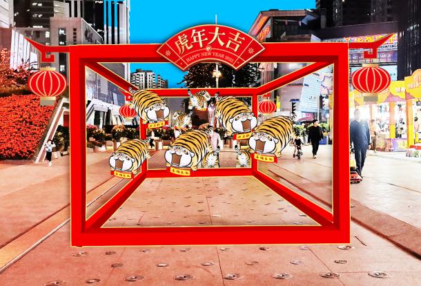 华强北商业步行街主街共3组花灯:“首善之区 幸福福田”灯组、“海鲜盛宴”灯组、“吉祥投币虎”灯组。