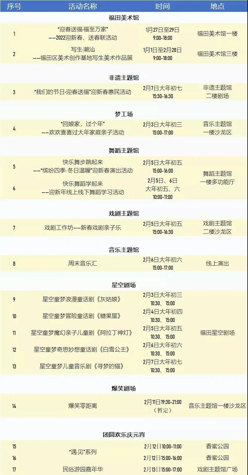 为丰富辖区居民以及留深过年人员春节文化生活,春节期间,在做好疫情防控的前提下,福田区公共文化体育发展中心推出“春节里的文化馆”系列活动,各主题文化馆将在场馆内献上一系列“线上+线下”精彩纷呈的文化活动,让大家在“家门口”就能开开心心享受形式多样的文化艺术盛宴。