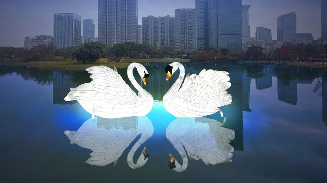 香蜜公园共5组花灯:天鹅灯组、“童年伙伴”灯组、草地氛围灯组、石斑鱼灯组、帝王蟹灯组。
