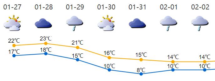 1月27日-29日深圳市(含深汕)多云间阴天,部分时间可见阳光,早晚有轻雾或零星小雨,其中27日气温17-22℃。