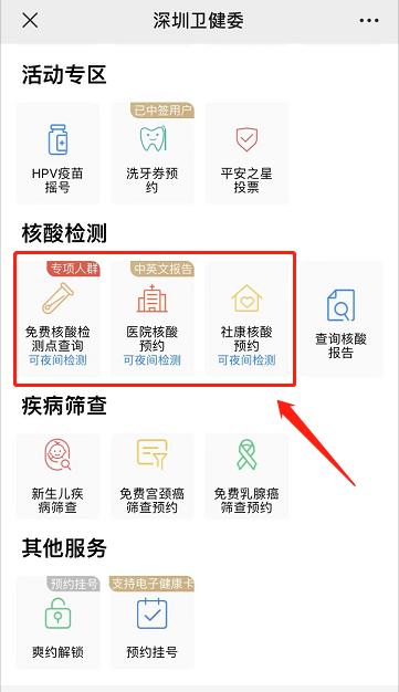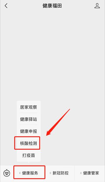 ② 点击菜单栏中的【健康服务】-【核酸检测】,即可根据自身需求选择预约机构。