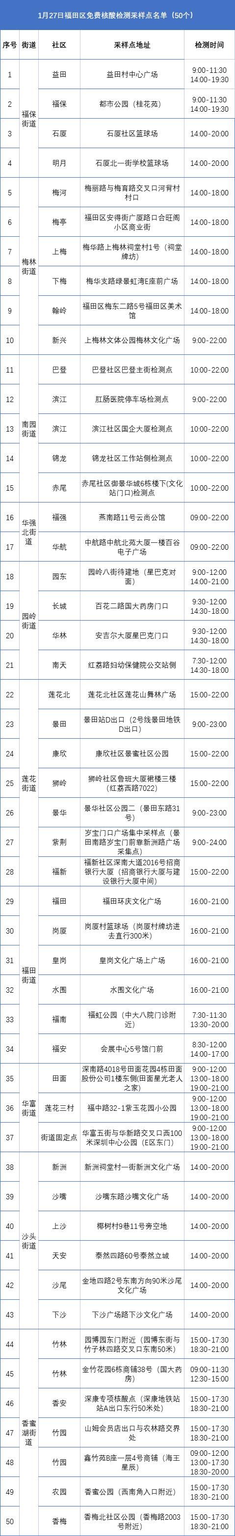 为方便居民进行核酸检测,1月27日,福田区设置50个免费的核酸检测采样点,为居民提供服务。