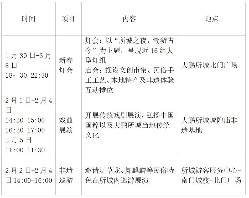 年初一至初五,每天下午将在大鹏所城城隍庙开展传统戏曲展演,京剧、川剧、黄梅戏等多类戏曲,并在大年初五当天表演大鹏当地原创大戏《东纵英雄刘黑仔》,以刘黑仔典故为原型,通过寓教于乐的方式展现给大众,弘扬中国国粹以及大鹏所城当地传统文化。