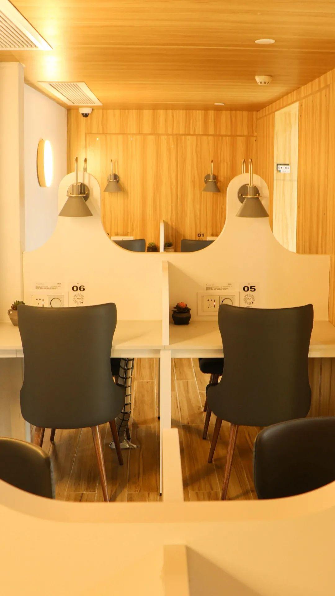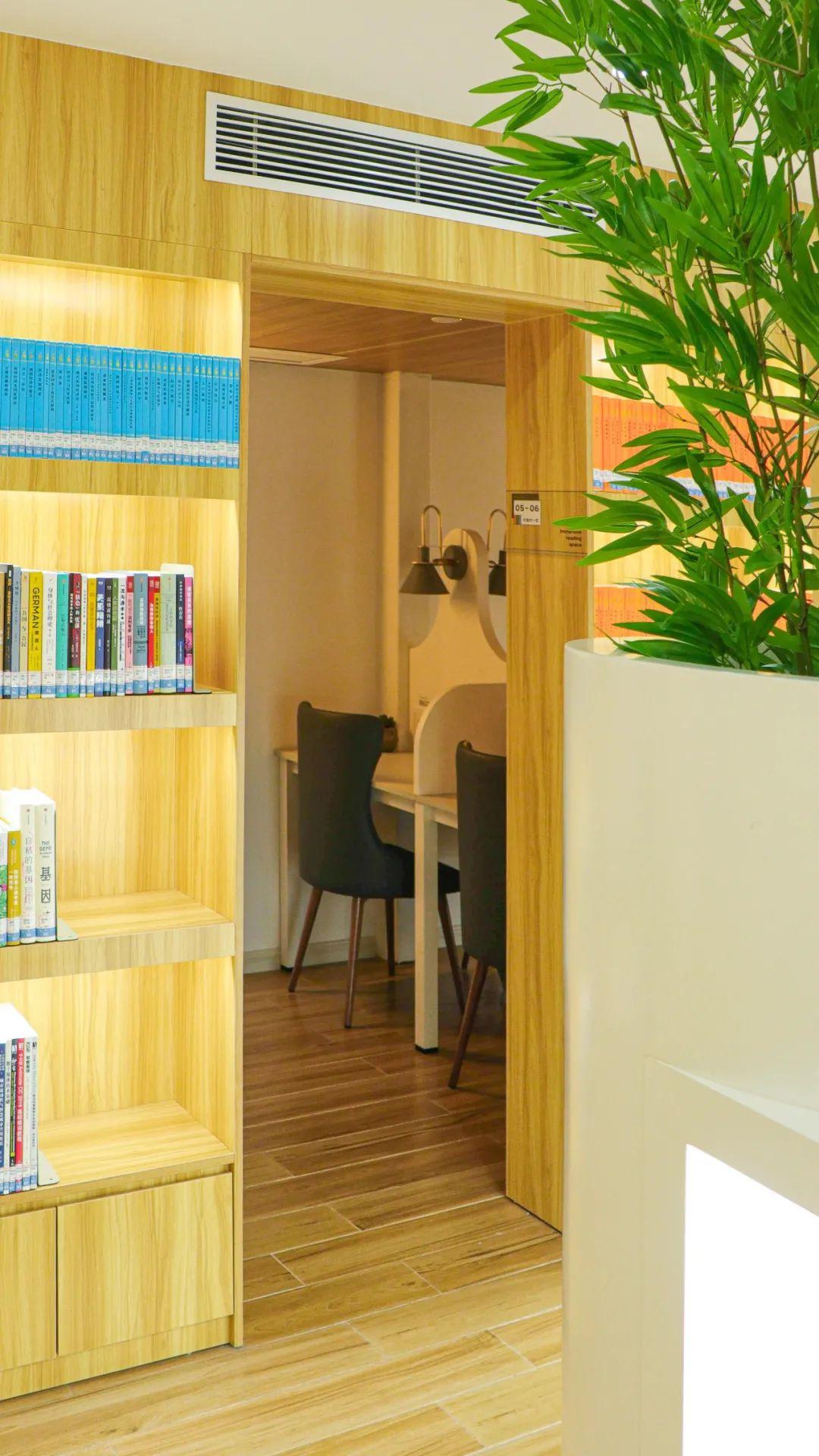 沉浸式一区共设置坐席15席,分布在书房一楼,根据指引找到预约位置,扫码即可开灯,木质隔板轻松打造私密空间,侧目可以看到墙壁上悬挂着的山水油画,融入古典情怀更添一份韵味。