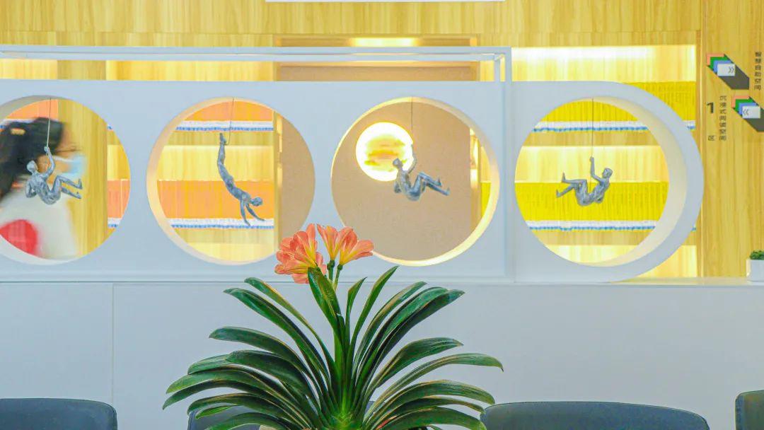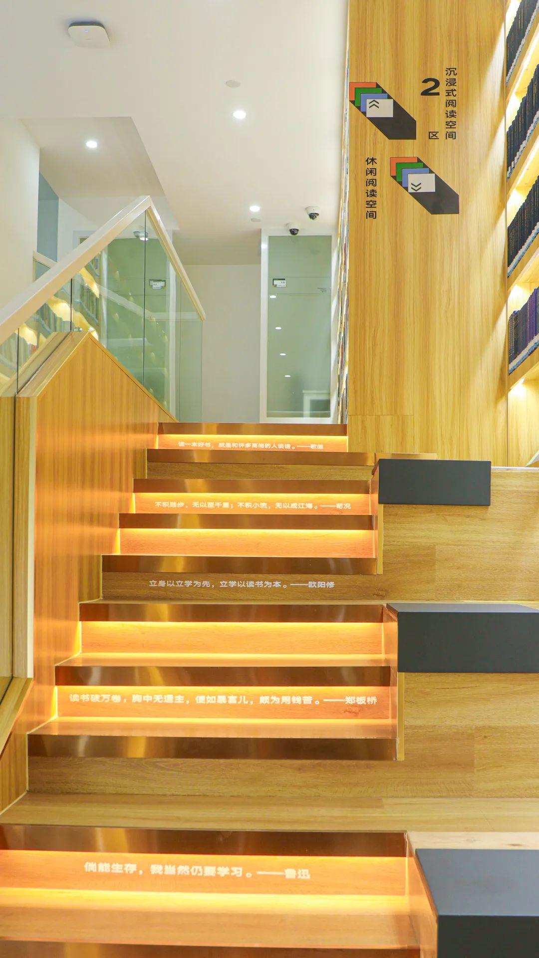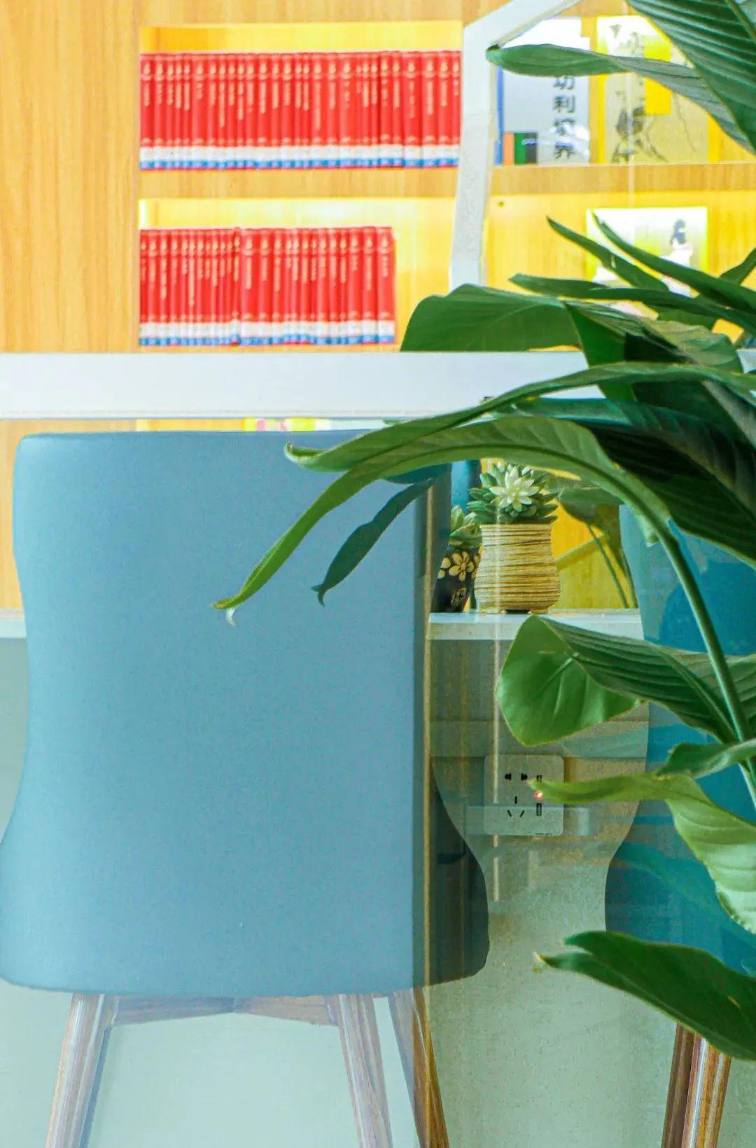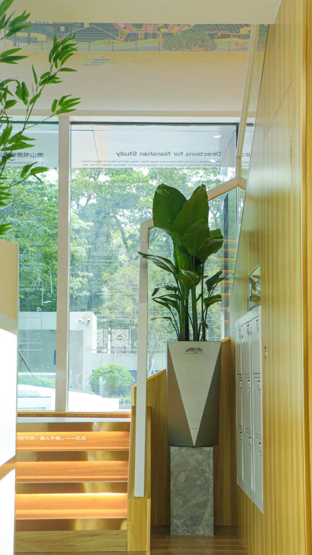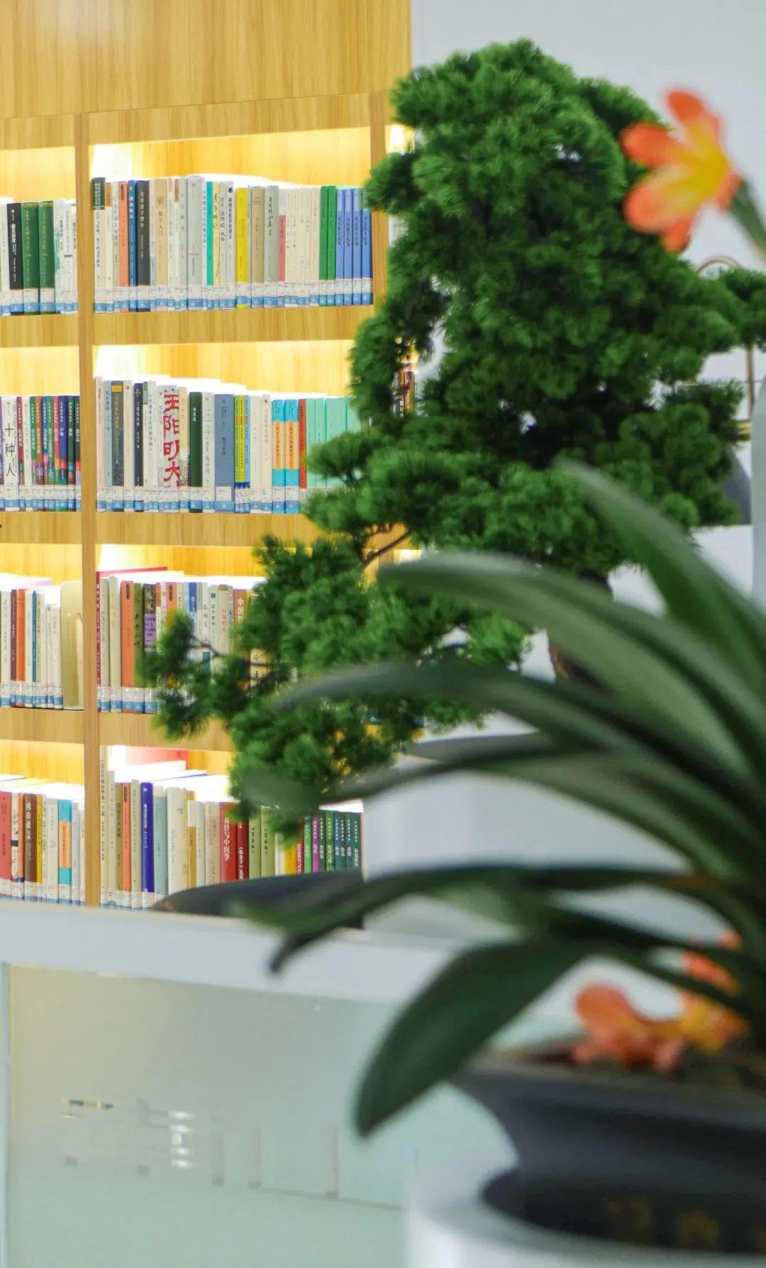沿着阶梯拾级而上,木阶梯晕染开的光线,将人引到了充满艺术感的二层阅读空间。沉浸式二区共设置坐席17席,几乎分布在二楼的各个角落,细节处松柏与君子兰的搭配,寓意坚韧谦逊的文人气节。