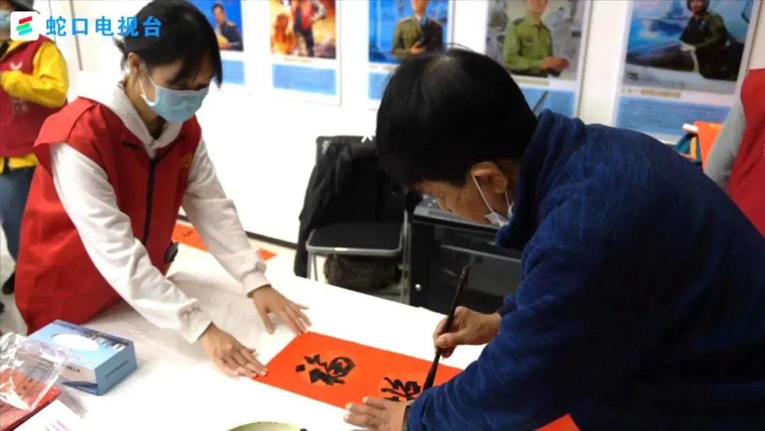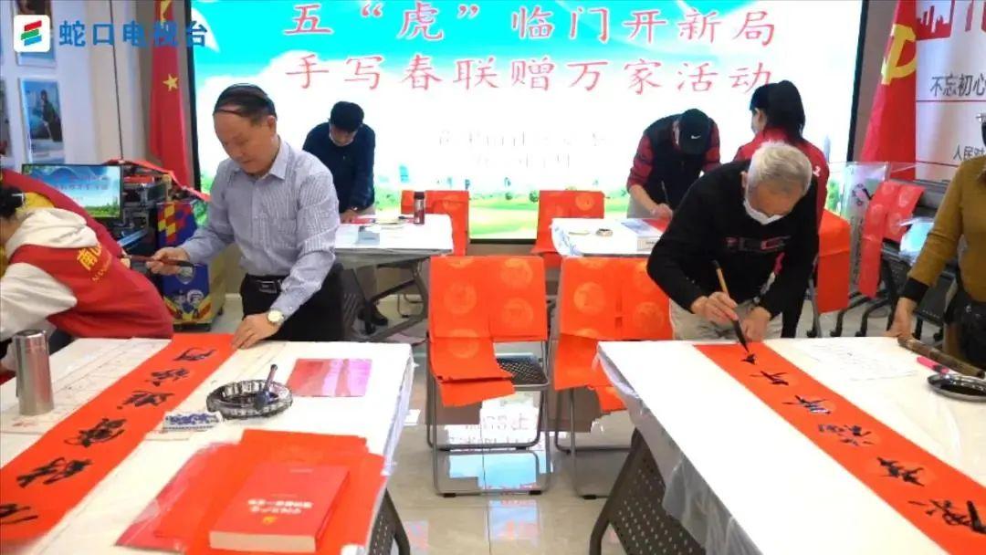 当天,花果山社区举办了“五‘虎’临门开新局 手写春联赠万家”活动,邀请了四海情老年大学4位书法老师来到党群服务中心为社区居民写春联。