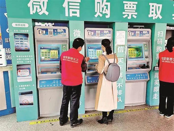 来自新桥街道的骨干志愿者宁彬富利用休息时间做志愿者,在微信购票取票处帮助旅客顺利取到回家汽车票,旅客不停地对他说“谢谢”。