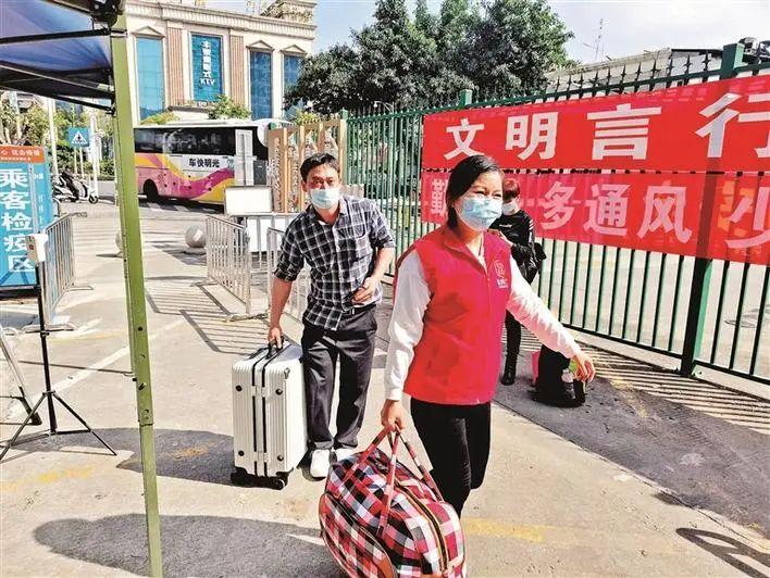 春运期间,松岗汽车站返乡旅客络绎不绝。志愿者蔡蜡花在为旅客提供问询、引导等常规志愿服务的同时,不忘提醒大家做好个人防护。