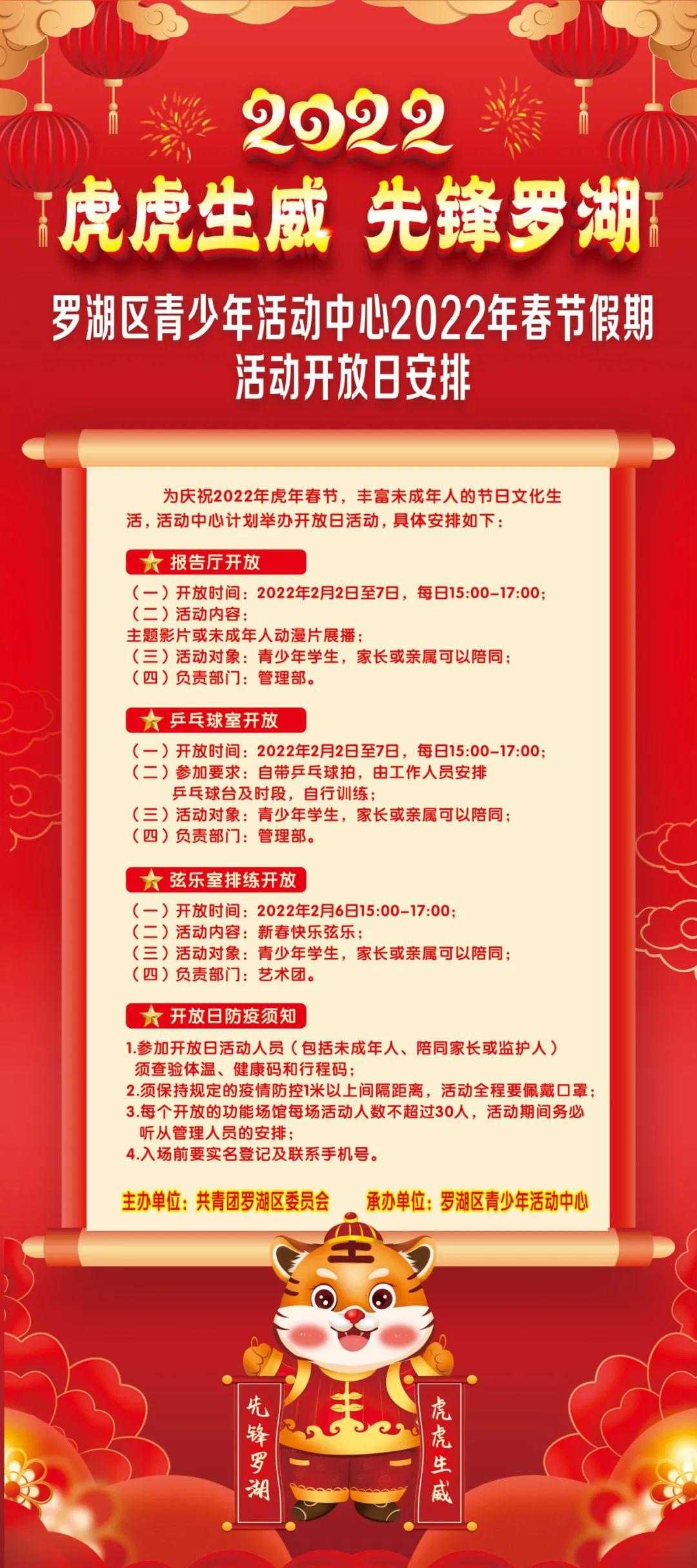 活动介绍:为丰富广大留深青年、罗湖居民春节假期生活,感受罗湖年味、丰富节日意义,罗湖团区委特开展“福虎七天乐,‘云’上过大年”——团团陪你过大年线上主题活动。各位小伙伴记得提前关注“青春罗湖”微信公众号,活动期间将于每天中午12点通过推文的形式更新不同主题的线上春节活动内容及参与方式~