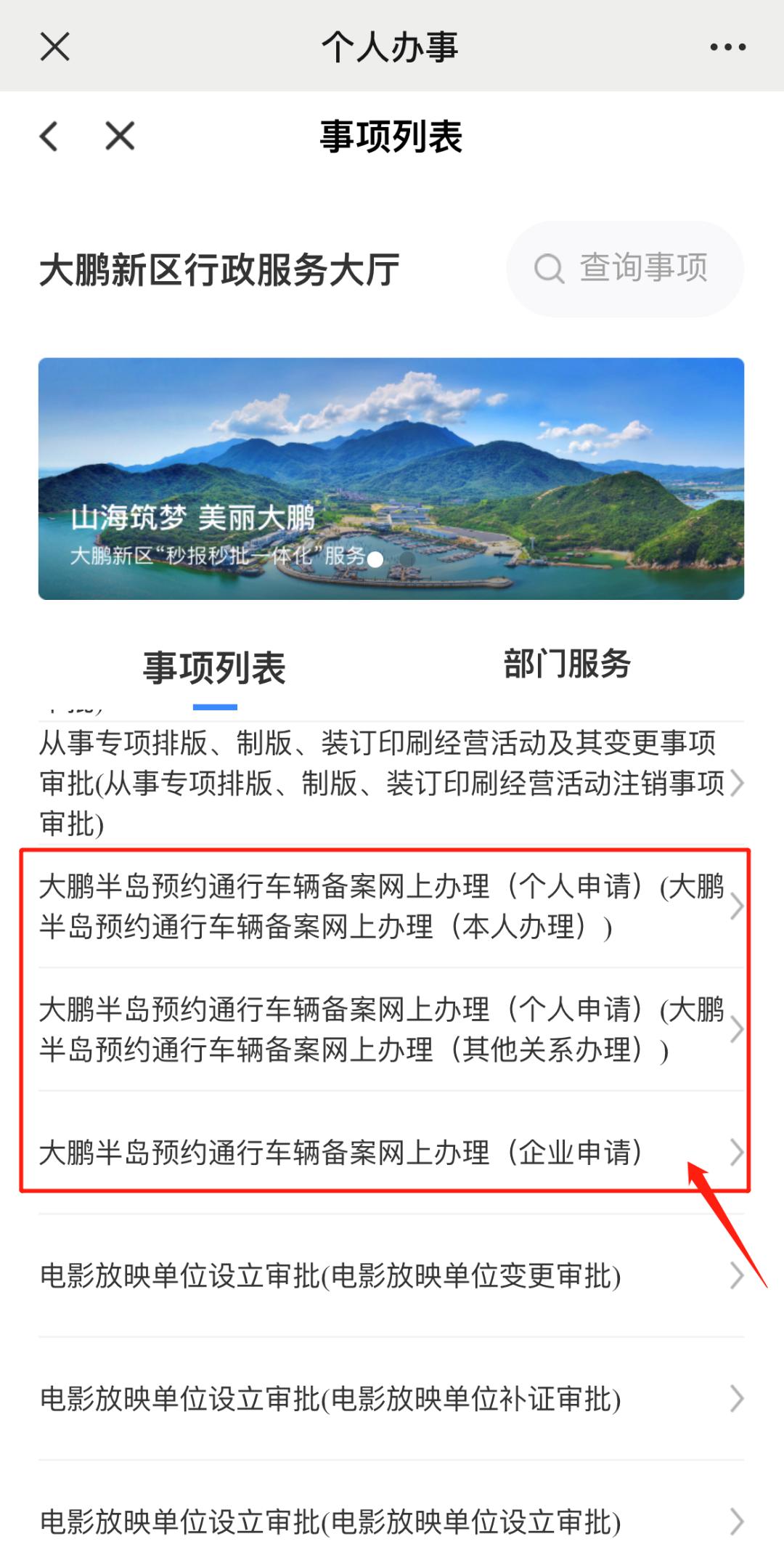 登录广东政务服务网(http://www.gdzwfw.gov.cn/),切换地区为“深圳市大鹏新区”,点击“大鹏交警大队”,选择“大鹏半岛预约通行车辆备案网上办理”,按照指引办理即可。