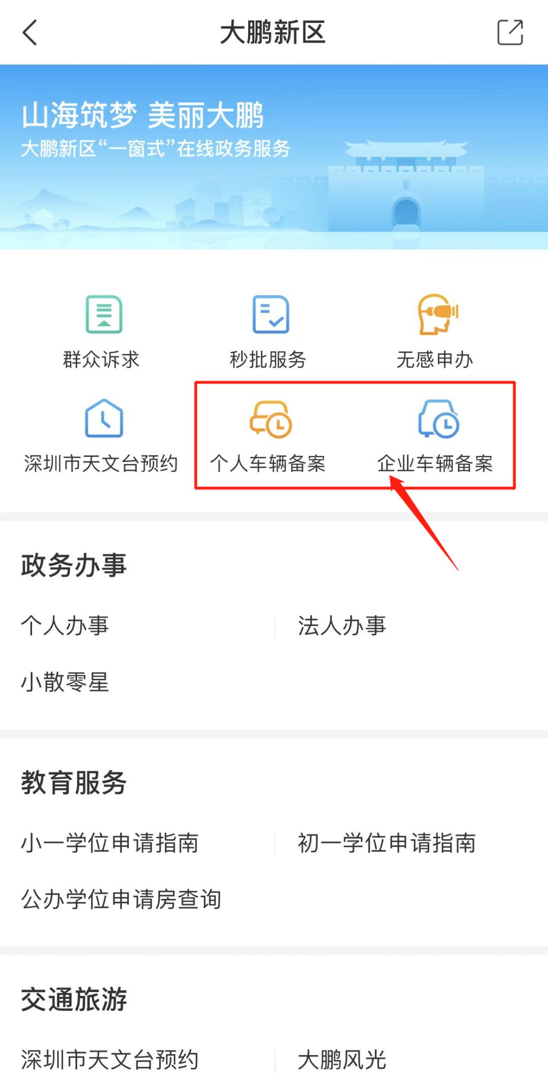 打开“i深圳”APP,依次点击『区级服务→大鹏新区→个人车辆备案/企业车辆备案』,按照指引办理即可。