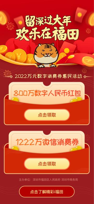 数字福红包可在福田区的数码家电、百货商超、时尚服饰、美食餐饮等上千家门店线下消费使用,让寻年味、办年货、逛年市的留深亲们享受到最实在的福利,把年过得福虎生旺、虎气冲天!