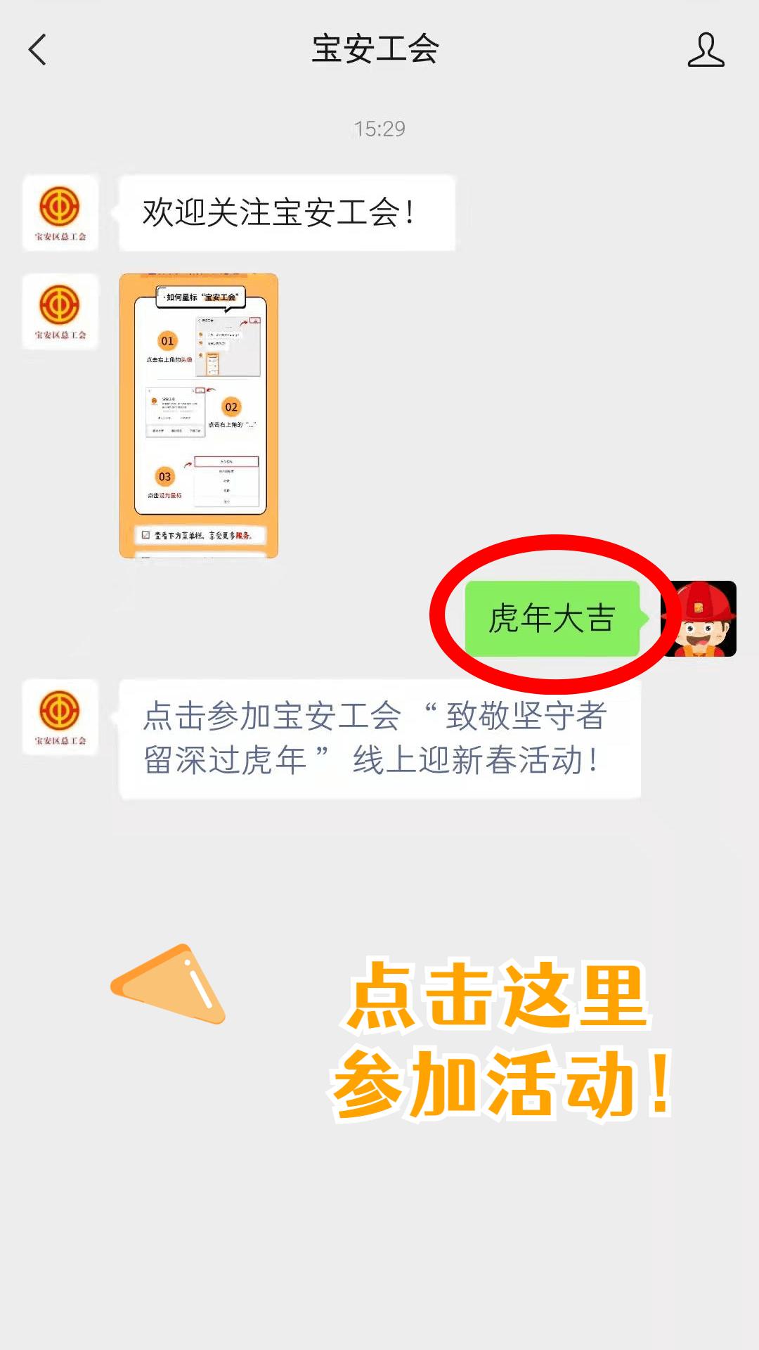 2.进入“宝安工会”微信公众号后,发送关键词“虎年大吉”获取抽奖链接;