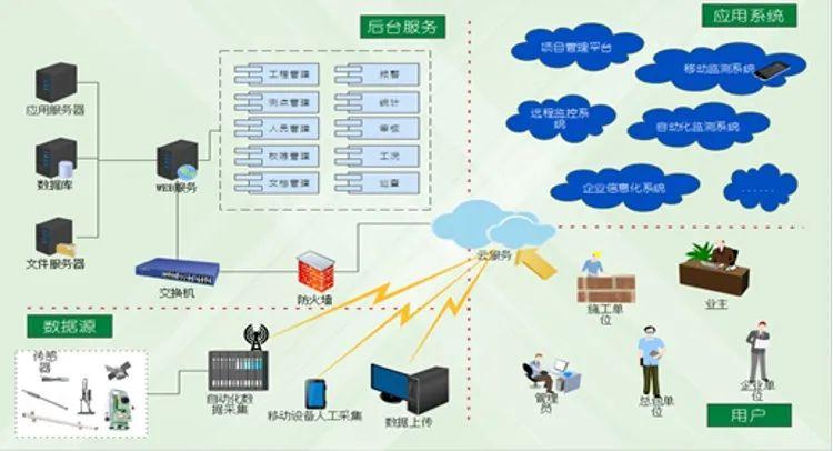 平台针对工程建设中不同管理人员的定位角色,设置了业主、施工单位、监理单位、监测单位及其他参建方不同业务需求的模块系统,具体分为五大模块,分别是:系统管理后台、项目管理后台、数据处理系统、Web发布系统、App发布系统(移动端),同时赋予不同的权限功能,使监测数据运用起来更加便捷时效。