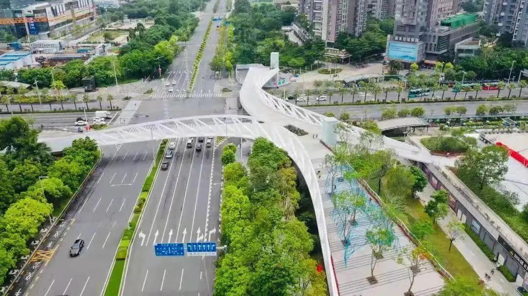 全长2公里的宝安滨海廊桥,采用弧形的标志性桥身设计,半透明的金属板网构筑桥身,分为地上、地面、地下三层,公共绿地面积共计4.19万平方米,犹如一条穿行于绿海中的白色巨龙。
