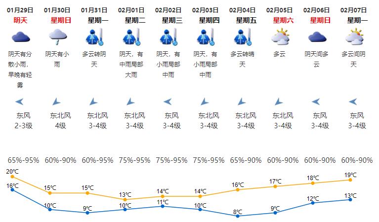 ☑ 29日夜间至30日受冷空气影响,阴天有小雨,最大阵风7-8级,气温明显下降;
