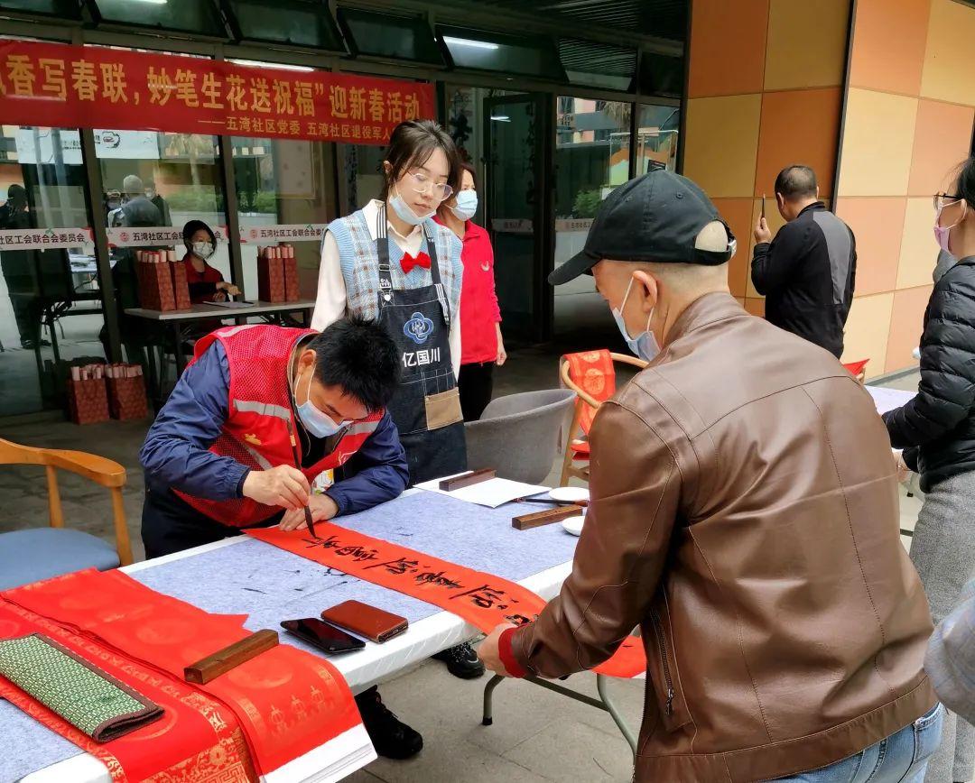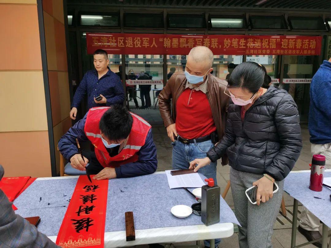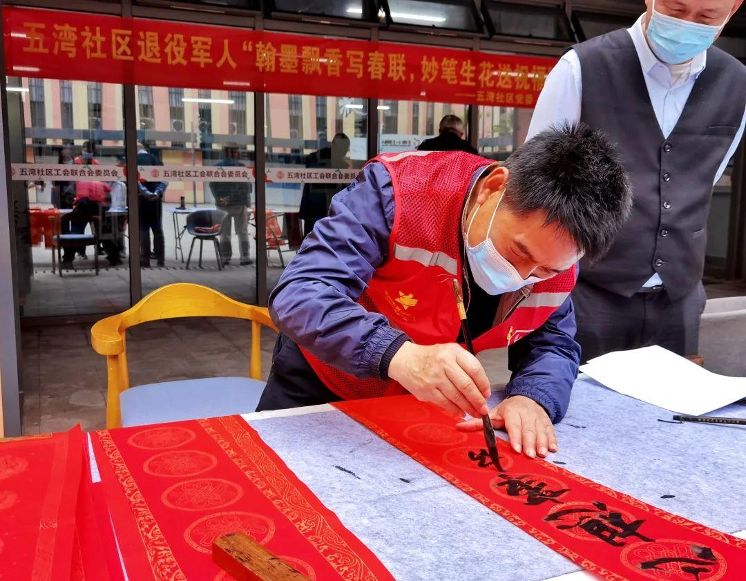 为表达对退役军人始终坚守在疫情防控一线岗位的敬意,近日,五湾社区党委、社区退役军人服务站在龙瑞佳园职工之家举行了“翰墨飘香写春联 妙笔生花送祝福”退役军人迎新春活动。这场活动以为退役军人写春联为主题,表达了社区党委和社区退役军人服务站对退役军人的深切关怀和祝福。