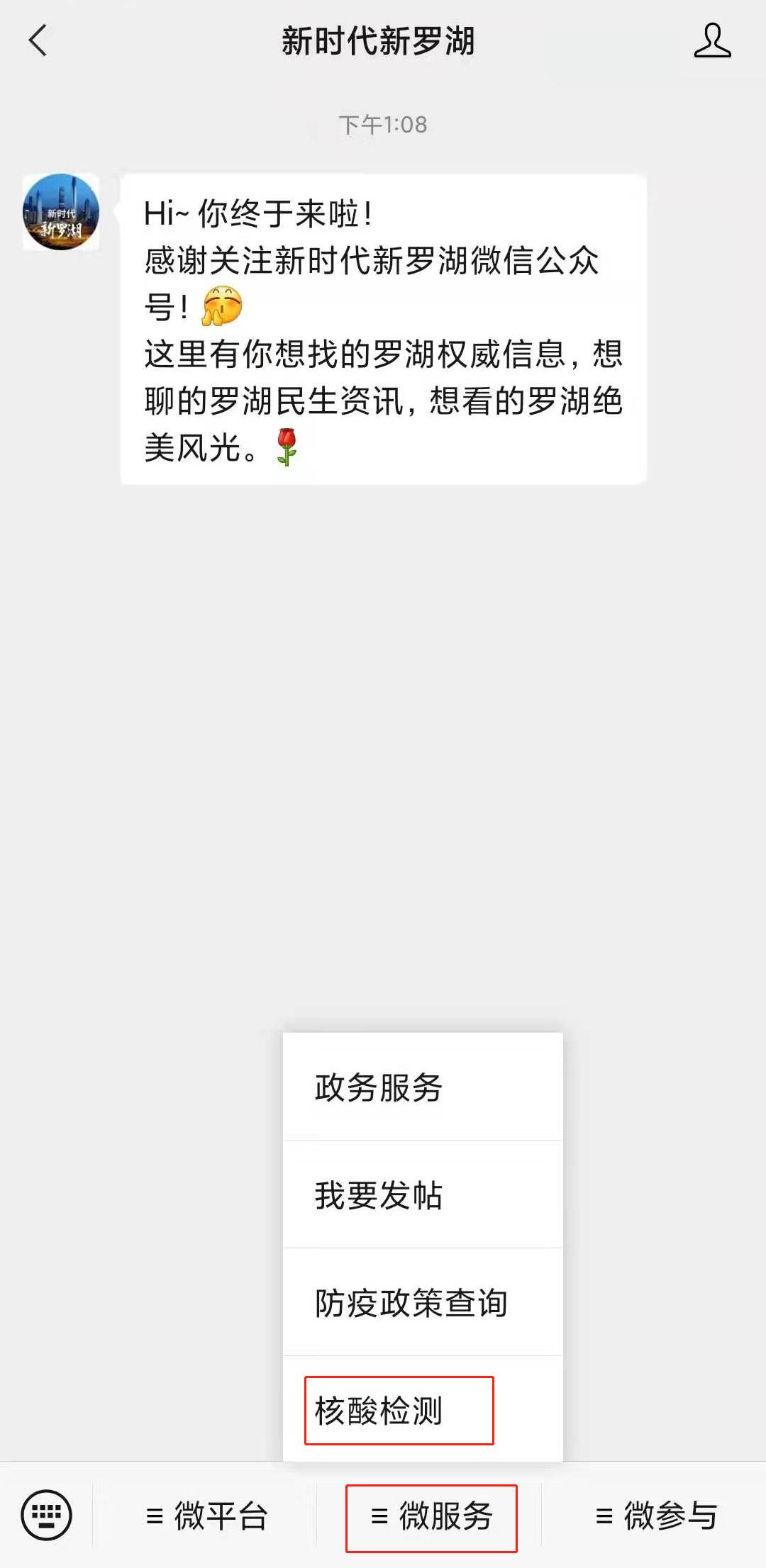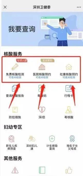 ② 点击菜单栏中的【微服务】-【核酸检测】,即可根据自身需求选择预约机构。