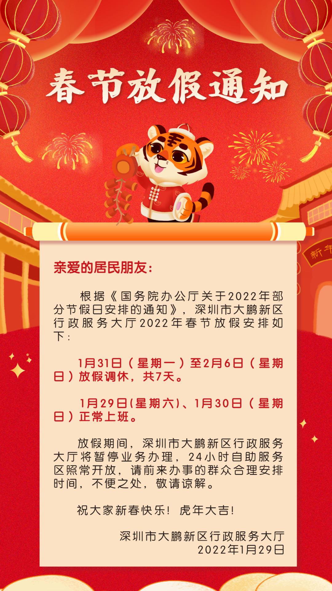 年年辞旧,岁岁迎新又一年新春佳节即将来临伴随着假期到来的还有大鹏新区行政服务大厅春节放假通知↓↓↓在这里大鹏政务服务衷心祝愿大家新年快乐,虎年大吉!END内容来源 大鹏政务服务转载请注明信息来源分享收藏点赞在看