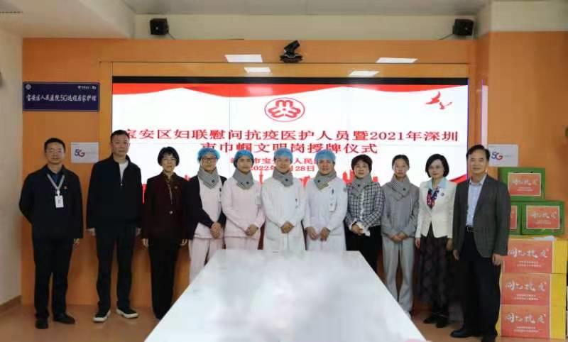 一行人来到宝安区中医院、宝安区人民医院,探访慰问一线抗疫医护人员,了解她们的工作情况,并为医护人员戴上围巾、送上慰问物资,感谢她们的一直以来的辛苦付出,同时送上新春祝福。