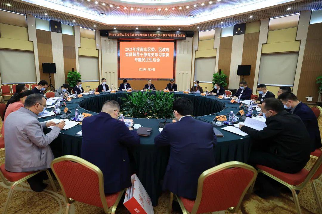 1月29日上午,南山区委、区政府党员领导干部党史学习教育专题民主生活会召开。会议坚持以习近平新时代中国特色社会主义思想为指导,认真学习贯彻党的十九届六中全会精神,按照“学史明理、学史增信、学史崇德、学史力行”和“学党史、悟思想、办实事、开新局”的目标要求,进一步落实省委“1+1+9”工作部署、市委“1+10+10”工作安排,努力打造坚定历史自信、践行时代使命、厚植为民情怀、勇于担当作为的坚强领导班子。