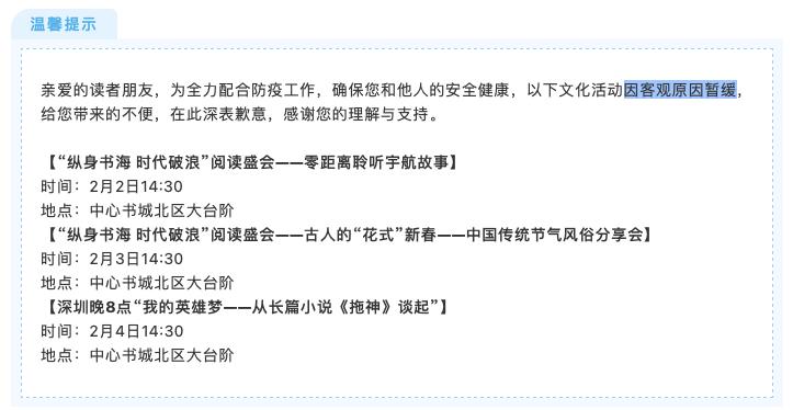 一、石岩街道分馆、石岩环湖碧道自助分馆、石岩街道各阅读中心及服务点临时闭馆,暂停到馆服务;