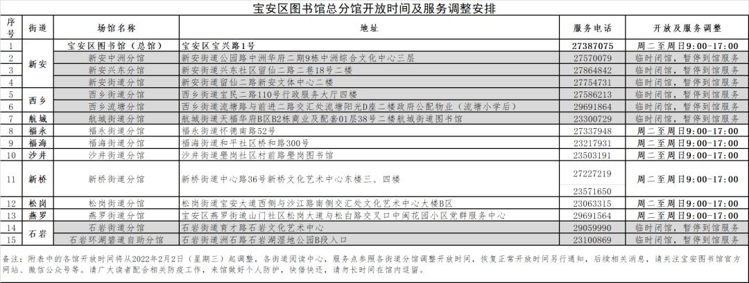 二、为支援社区防疫工作,新安街道、西乡街道、航城街道辖区内分馆、阅读中心及服务点临时闭馆,暂停到馆服务;