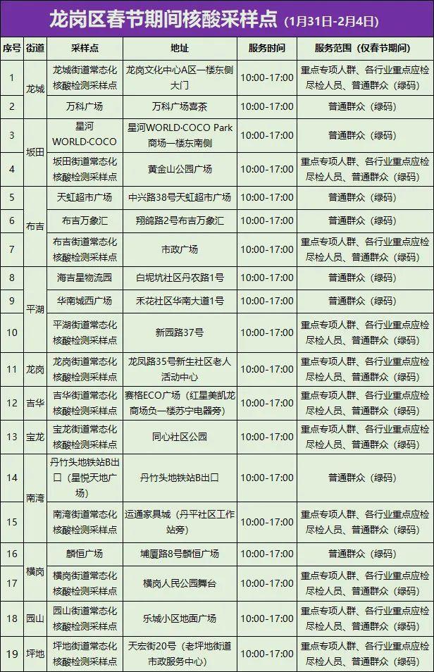 为方便市民进行核酸检测,春节期间(1月31日-2月4日),龙岗区设置多个核酸检测采样点供有需要市民前往。