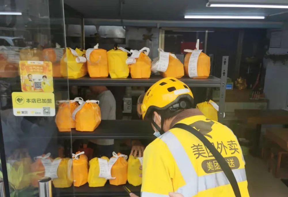 图片来源:新华社,图为外卖小哥在开放式餐架取餐