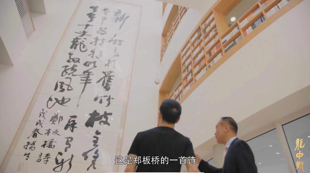 我想跟你解释一下这幅字。当初我写字是在地上写,用拖把写的,(这幅字)有17米高,很难写的。“新竹高于旧竹枝”,我为什么要写新竹跟旧竹呢?因为老师跟学生的关系,实际上就是新竹跟旧竹的关系;我们这个中文大学跟香港中文大学的关系,也是新竹与旧竹的关系;整体的话,作为一个文化传承,我们都是新竹,学校的功能就是新竹跟旧竹的关系,所以新竹要高于旧竹枝。那么怎么才能高呢?“全凭老干为扶持”,都是老干会扶持。“明年再有新生者,十丈龙孙绕凤池”,这是龙,香港中文大学是凤,“十丈龙孙绕凤池”。这是郑板桥的一首诗,当年搬进来的时候,我就把它放在这个地方。