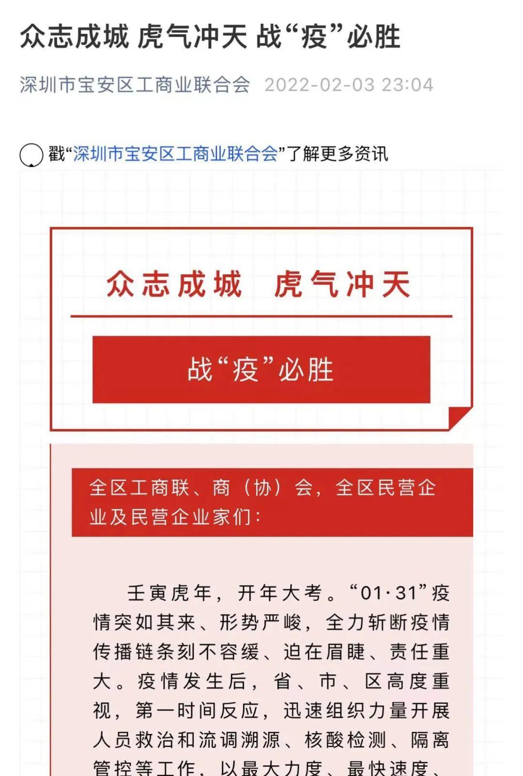 区工商联、区总商会向全区工商联、商(协)会和广大民营企业发出倡议,号召弘扬宝商精神、压实主体责任,强化宝商担当、科学防控疫情,展现宝商价值、有序复工复产,彰显宝商风采、履行社会责任。截至目前,宝安累计收到社会捐资捐物价值超过1089万元。