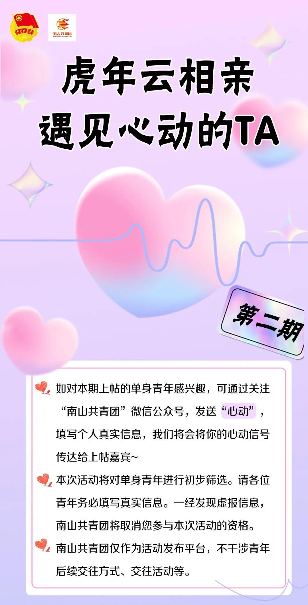 关注公众号“南山共青团”,后台回复心动,即可获得心动反馈链接。请各位青年如实、认真地填写反馈信息,提前准备好自己的自我介绍和个人照片~