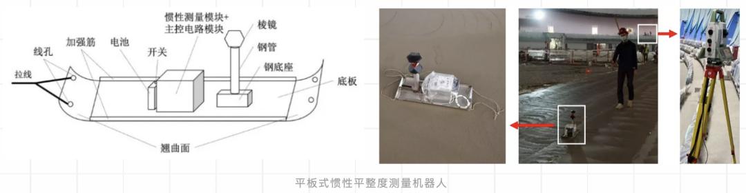 冰面基底平整度测量需求贯穿场馆建设的始终,针对场馆建设不同时期的特点,团队制定了相应的测量方案并研制了专用的设备,发明了一种平板式惯性平整度测量机器人,辅助施工期混凝土冰面基底精准磨平作业。冰面基底竣工后需要进一步验收,团队发明了一种轮式惯性平整度测量机器人,实现地面相对高程精密测量以及平整度的全面评估。