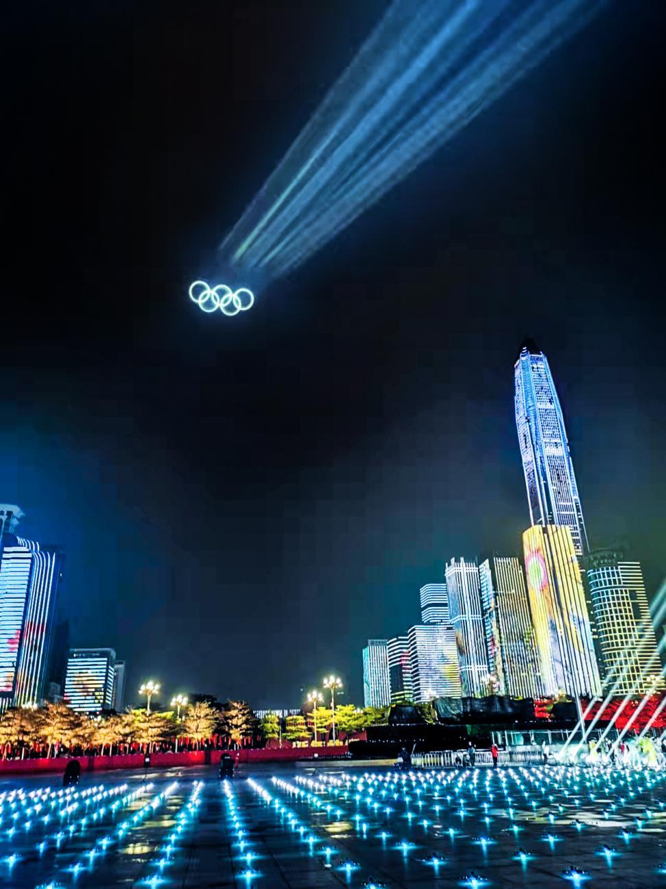 在深圳分会场的表演中,四条耀眼的激光光柱冲上云霄,用激光在云上写出“天下一家”四个大字,并在云端打出“五环”标志。记者了解到,此项表演由南山企业光峰科技提供技术支持,成功打造了震撼人心的冬奥光影秀。