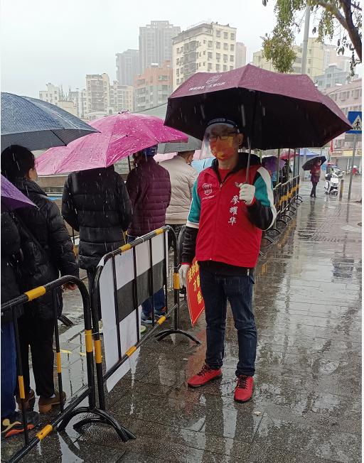叫上日常搭档的伙伴、穿上心爱整洁的红马甲,廖耀华一面拉起微信群,招呼热心的朋友和群众源源不断地入群做志愿者,一面戴好口罩,急匆匆赶往最近的核酸检测点帮助维持现场秩序。这个春节,他又奔走在与群众共同抗疫的路上。