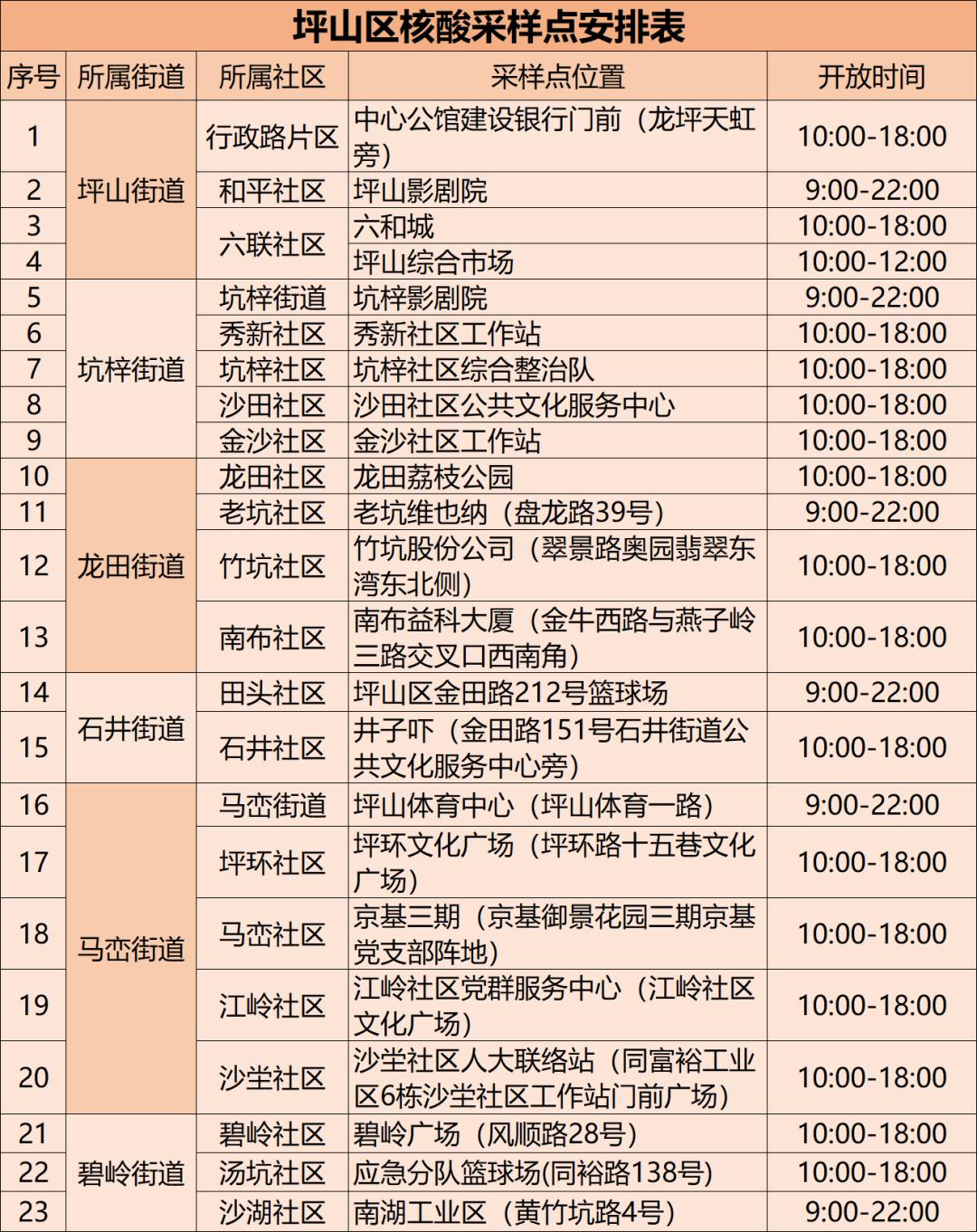 三、做好核酸检测。请您抵达坪山后,在24小时内到就近核酸采样点开展1次核酸检测。核酸采样点设置情况请前往“坪山发布”公众号查询了解。请全区各类企业以及经营场所组织返深员工就近核酸检测,返深员工持阴性证明返岗上班。全区党政机关、企事业单位带头落实返深员工核酸检测及返岗健康管理措施。