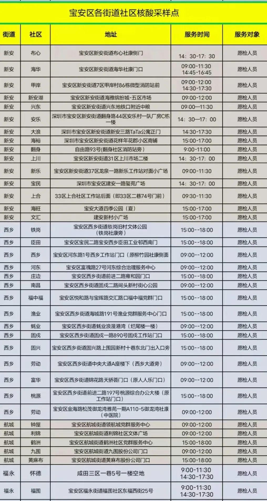 宝安区各街道社区核酸采样点