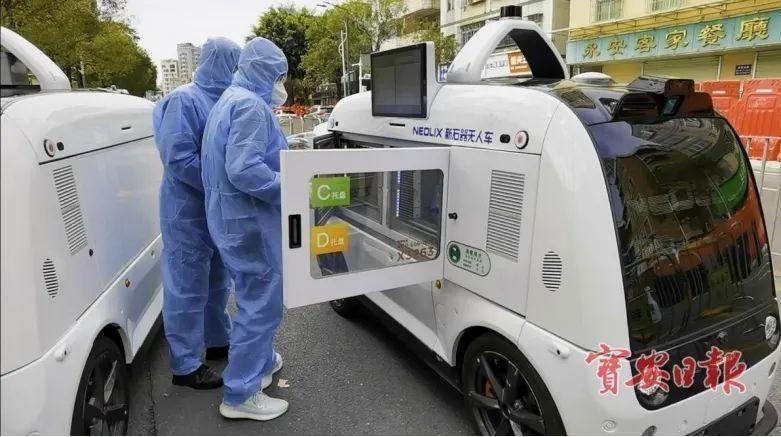 “无人车”高效配送防疫物资,防疫工作人员正进行物资调配。