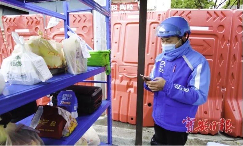 图为外卖小哥将外卖放置到防范区指定收货架上。