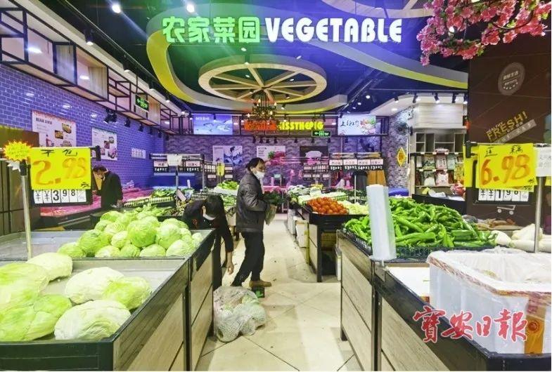 防范区市民到超市采购物资,各大超市货物供应充足,价格平稳。