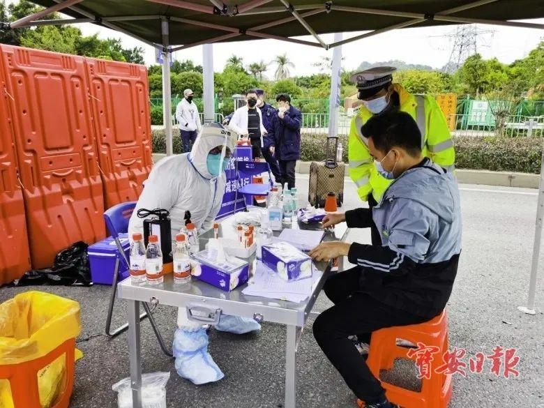 返回石岩的市民在卡口登记个人信息。目前,市民需要出示绿码,现场进行核酸检测后,才能回到住地。