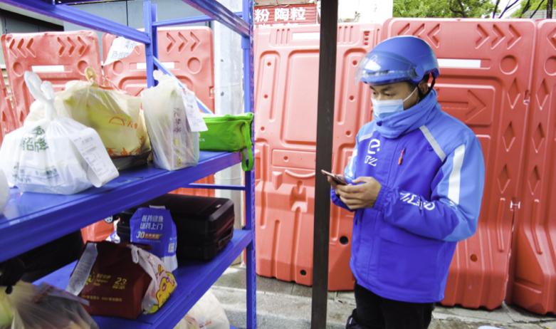 “无人车”高效配送防疫物资,防疫工作人员正进行物资调配。