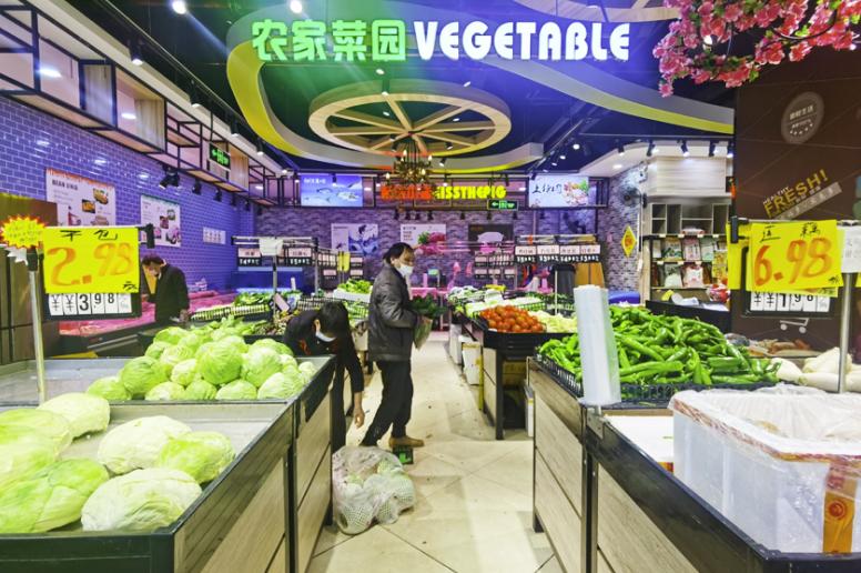 防范区市民到超市采购物资,各大超市货物供应充足,价格平稳。