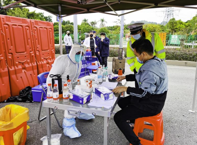 返回石岩的市民在卡口登记个人信息。目前,市民需要出示绿码,现场进行核酸检测后,才能回到住地。