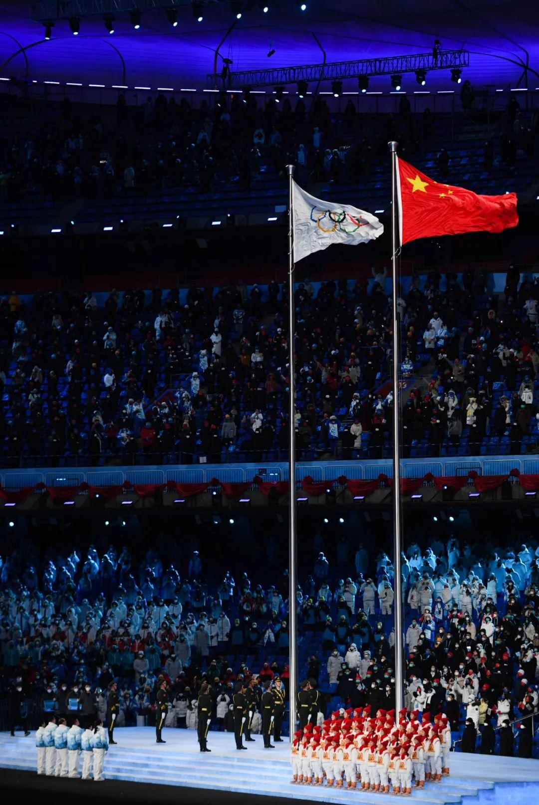 2月4日晚,第二十四届冬季奥林匹克运动会开幕式在北京国家体育场举行。这是奥林匹克会旗与中华人民共和国国旗在开幕式上升起。新华社记者 薛宇舸 摄