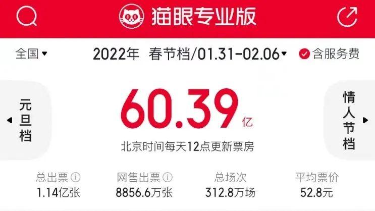 根据猫眼专业版数据,截止到2月7日零时许,春节档总票房已经突破60.39亿,春节档总出票1.14亿张,平均票价为52.8元。而这个数字背后是史上最贵春节档。