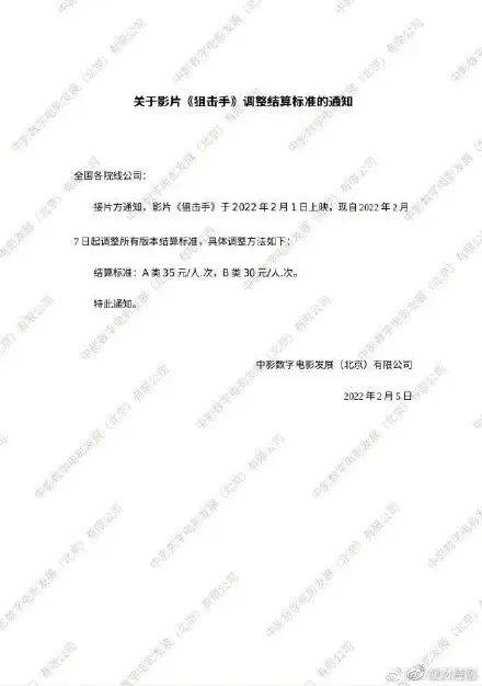 2月6日,《狙击手》还宣布自2月7日起下调所有版本结算价格至A类35元,B类30元(各降5元),这也是今年春节档8部新片里首部降低限价的影片。